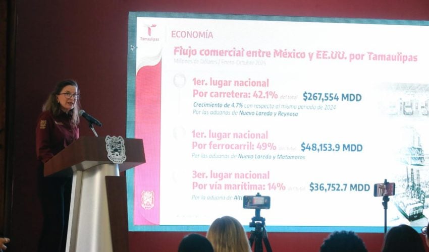 En su intervención la secretaria de Economía, Ninfa Cantú Deándar destacó que Tamaulipas es el sexto estado exportador de México con 27,871.2 millones de dólares, con un crecimiento de 6.4% y además dio a conocer otros indicadores que sitúan a Tamaulipas entre los estados con mejor crecimiento, con un aumento de 2.5% del PIB en 2024; un incremento de 12.2% en el indicador de la actividad industrial, en primer lugar nacional, además de un aumento de 46.8 por ciento de inversión extranjera directa en 2025 y 3.1% de aumento en la actividad económica estatal, ocupando también el primer lugar nacional con un 4.7% de aumento en el comercio carretero con Estados Unidos y 5.2% de crecimiento real en el salario registrado ante el IMSS.