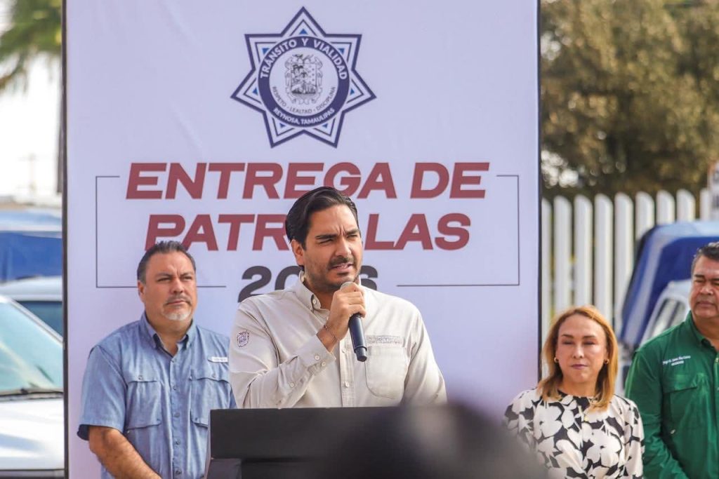 El Alcalde entregó las llaves de las nuevas unidades al Secretario de Seguridad Pública, Tránsito y Vialidad Municipal, Geovanni Barrios Moreno, quien estuvo acompañado por la Directora de Tránsito Iris Alondra Chavira Ríos y los elementos de la corporación, así como funcionarios municipales y miembros del Cabildo local.