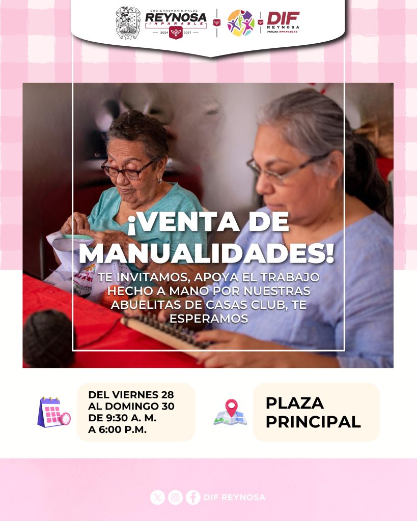 A fin de apoyar la economía de los adultos mayores, el Sistema DIF-Reynosa que preside Carlos Luis Peña Garza, extiende una invitación a la ciudadanía para sumarse y apoyar el talento de las abuelitas de Casas Club, quienes estarán ofreciendo venta de manualidades.