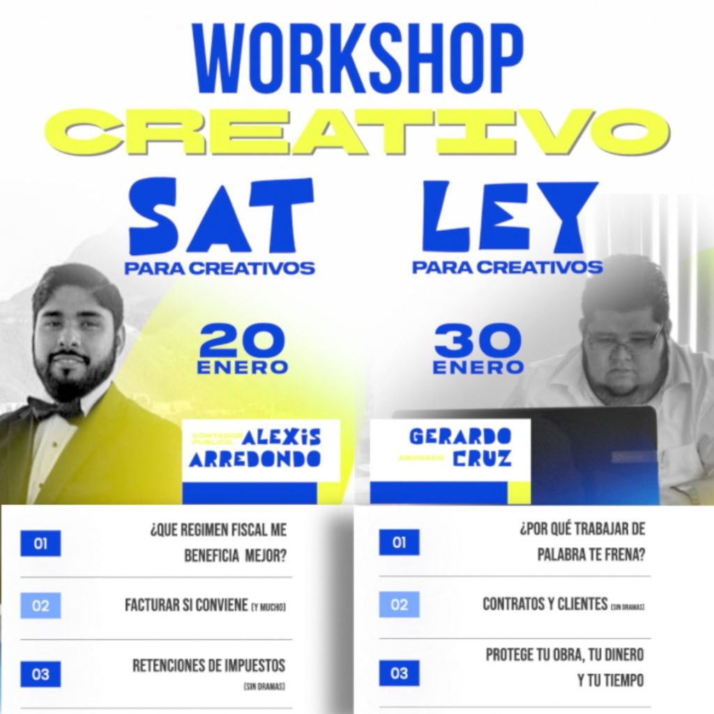 La serie inicia el 20 de enero con el taller SAT para Creativos, impartido por el contador público Alexis Arredondo, donde se abordarán temas relacionados con régimen fiscal, facturación y retenciones de impuestos.