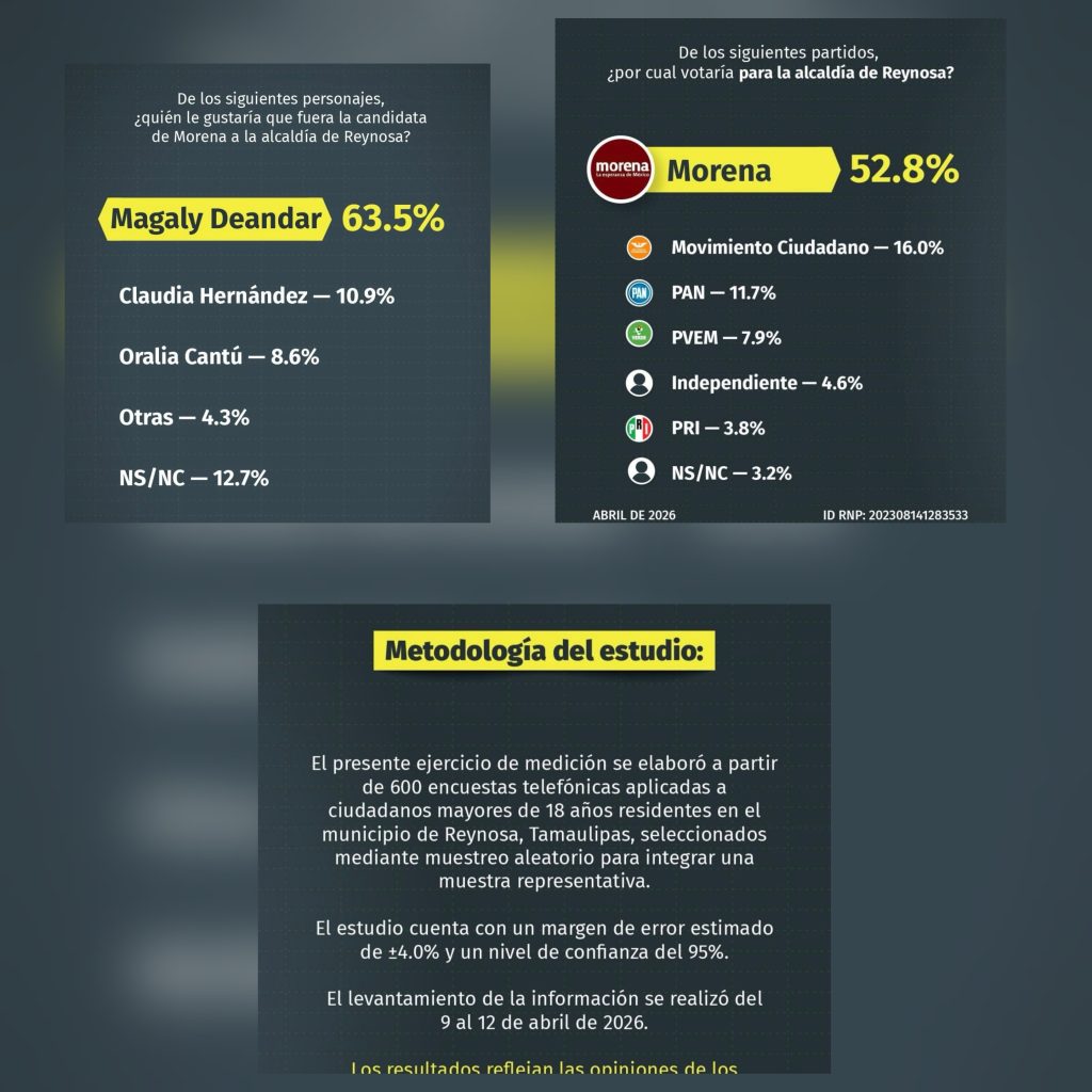 Los resultados corresponden al momento del levantamiento de la información y muestran el escenario actual de opinión pública en Reynosa de cara al proceso electoral.