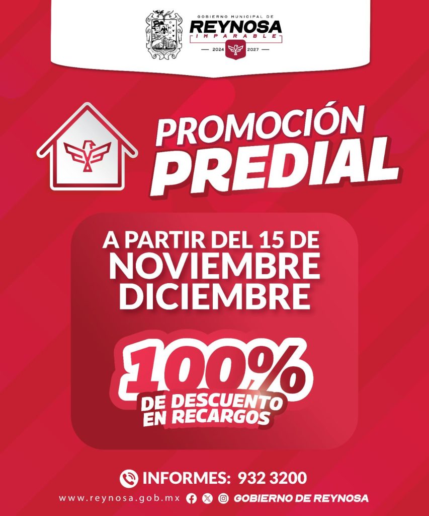 ✅ El Gobierno Municipal de #Reynosa, que preside el Alcalde Carlos Peña Ortiz, ofrece 100% de descuento en recargos del Impuesto Predial hasta el 31 de diciembre. Adultos mayores, jubilados, pensionados y personas con discapacidad obtienen 50% de descuento en el ejercicio fiscal 2025.
