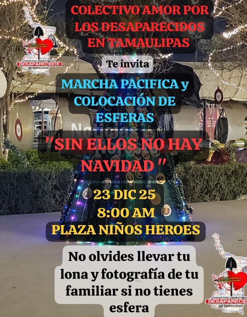 Por redacción El colectivo de desaparecidos en Tamaulipas hace la invitación a familiares de personas desaparecidas y convocan a la ciudadanía a participar en la marcha denominada “Sin ellos no hay Navidad”, que se realizará este martes 23 de diciembre en la ciudad de Reynosa, como un acto de memoria, exigencia y esperanza por el […]