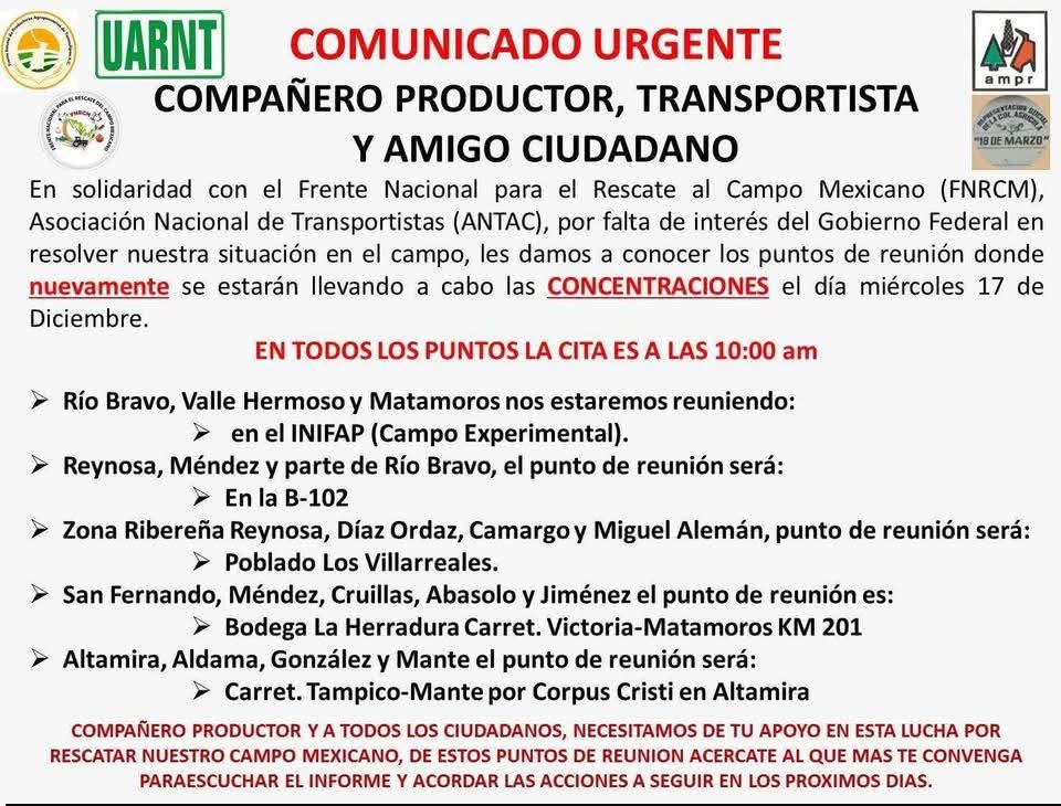 Productores y transportistas convocan a concentraciones en Tamaulipas