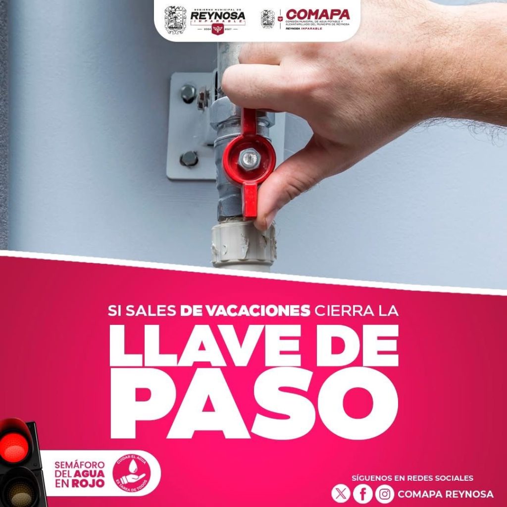 Con el objetivo de fomentar la cultura del cuidado del agua y prevenir incidentes en los hogares, la Comisión Municipal de Agua Potable y Alcantarillado de Reynosa exhorta a los usuarios que saldrán de la ciudad en este periodo vacacional a cerrar la llave de paso de sus domicilios. Debido a que el municipio se […]