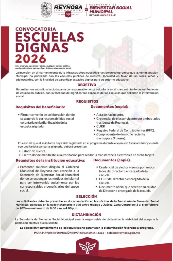 El Alcalde Carlos Peña Ortiz, lanzó a través de la Secretaría de Bienestar Social, la Convocatoria del programa “Escuelas Dignas 2026”, una iniciativa que busca mejorar la calidad de la educación en Reynosa mediante el mantenimiento de las instituciones públicas, garantizando espacios dignos para el entorno educativo de niños, niñas y adolescentes. Este programa tiene […]