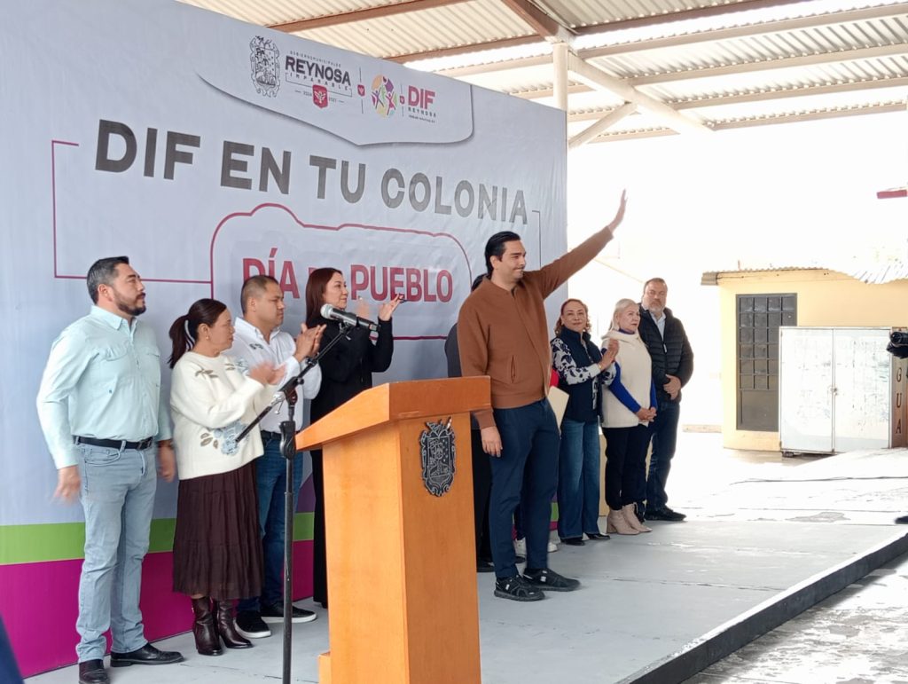Reynosa, Tamaulipas. En la brigada del sistema DIF en la colonia Arcoíris, el alcalde Carlos Peña Ortiz, pide a los padres de familia y vecinos a cuidar a los sus hijos y los hijos de sus vecinos, haciendo referencia a la problemática que continua que muchos menores no acuden a la escuela por falta de recursos económicos.