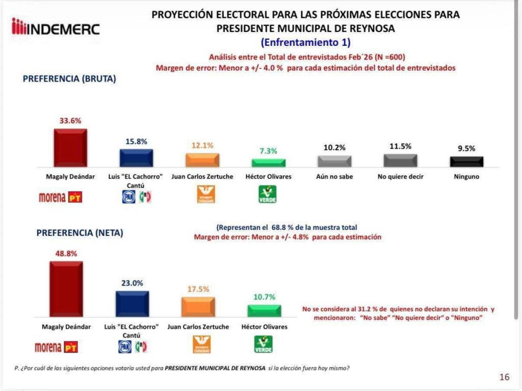 – La diputada local Magaly Deándar se posiciona como la aspirante mejor colocada de MORENA para la Presidencia Municipal de Reynosa en 2027, de acuerdo con una encuesta de la firma INDEMERC. El estudio, realizado del 13 al 15 de febrero de 2026 con 600 entrevistas telefónicas, un margen de error de ±4% y 95% […]