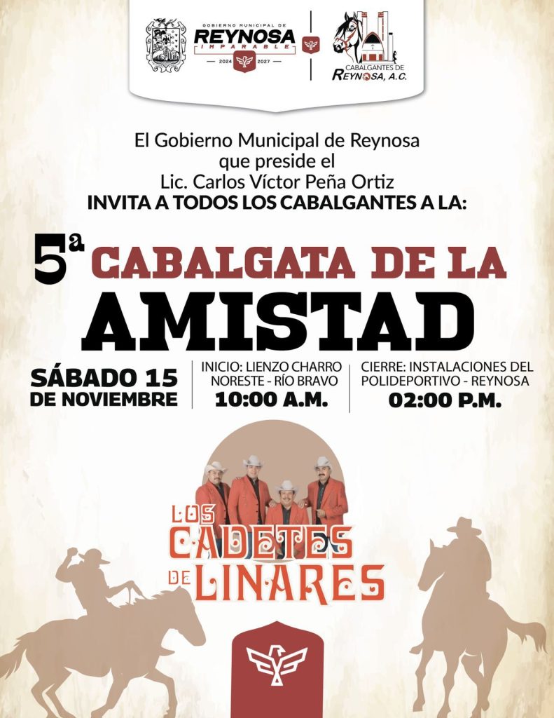 El Gobierno Municipal de Reynosa, que encabeza el Alcalde Carlos Peña Ortiz, invita a todas y todos los cabalgantes a la Quinta Edición de la Cabalgata de la Amistad, celebrando la tradición y el orgullo del Norte de Tamaulipas. Además, podrás disfrutar de la gran presentación musical de los triunfadores 𝗖𝗮𝗱𝗲𝘁𝗲𝘀 𝗱𝗲 𝗟𝗶𝗻𝗮𝗿𝗲𝘀. ¡Te esperamos!🗓️ […]