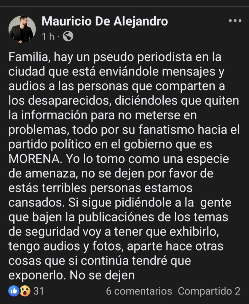Mauricio De Alejandro denuncia presión y amenazas: acusa a “pseudo-periodista” pro-MORENA de pedir censura sobre casos de desaparecidos
