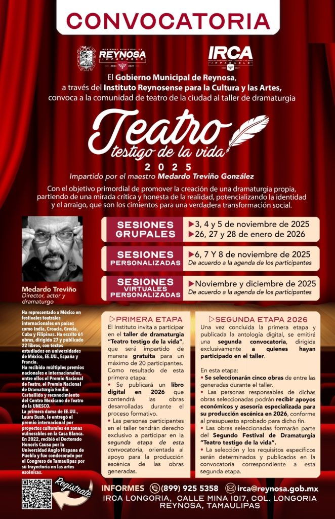 El Gobierno de Reynosa, que preside el Alcalde Carlos Peña Ortiz, invita a creadores teatrales a participar en el Taller gratuito “Teatro, testigo de la vida” 2025, impartido por el Maestro tamaulipeco Medardo Treviño González. El Taller busca fomentar una dramaturgia crítica y honesta, fortaleciendo la identidad y el arraigo como base para la transformación […]