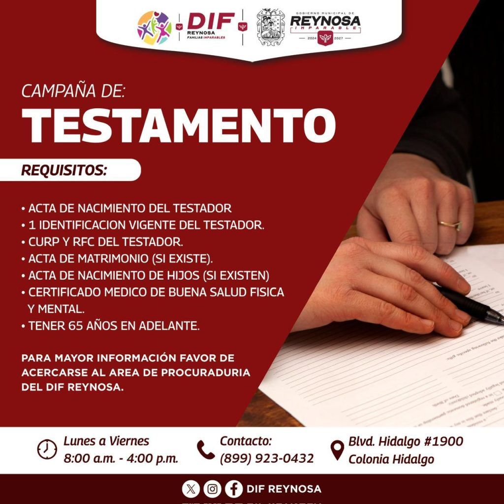 El Sistema DIF-Reynosa que preside Carlos Luis Peña Garza y el Voluntariado que encabeza Alejandra Yelitza Garza, invitan a la población de 65 años en adelante a participar en la Campaña de Testamento, una iniciativa que busca promover la cultura de la previsión y fortalecer la seguridad jurídica de las familias. Realizar un testamento es […]