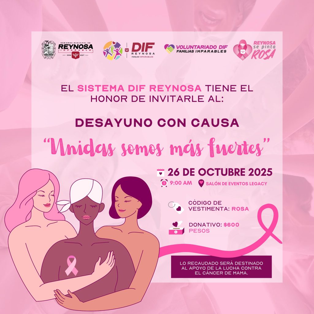 Invita DIF-Reynosa y Voluntariado al Desayuno con Causa “Unidas Somos Más Fuertes” en apoyo a la lucha contra el cáncer de mama