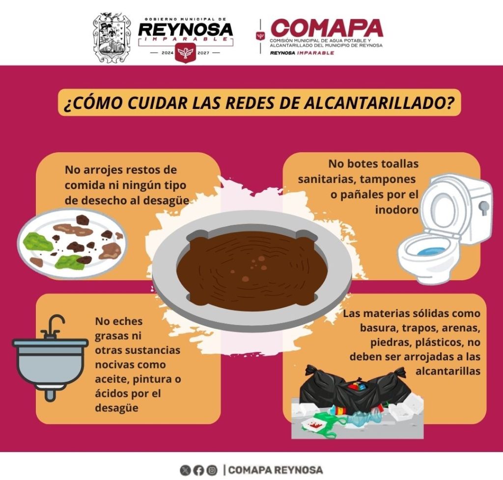 La Comisión Municipal de Agua Potable y Alcantarillado de Reynosa hace un llamado urgente a la ciudadanía para cuidar las redes de alcantarillado y evitar taponamientos que afectan el servicio en toda la ciudad. El organismo recuerda a la población que no se deben arrojar restos de comida, grasas, aceites, pintura, ácidos, toallas sanitarias, tampones, […]