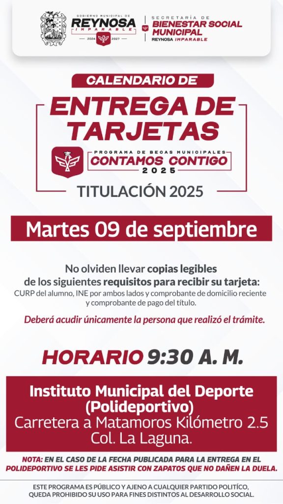 El Presidente Municipal, Carlos Peña Ortiz, invita a los nuevos profesionistas a la Entrega de Tarjetas de Becas para Titulación Profesional, que se llevará a cabo este martes 9 de septiembre a partir de las 9:30 de la mañana en el Polideportivo Reynosa. El Gobierno de Reynosa apoya la educación de los universitarios hasta la […]