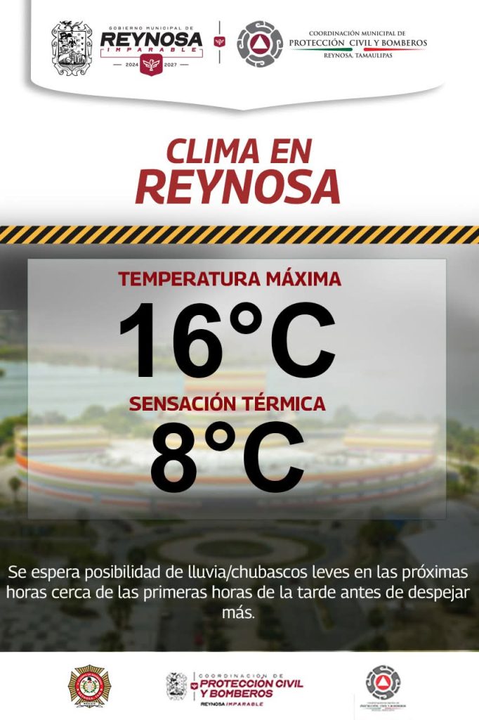 El Gobierno Municipal de Reynosa recomienda a la población tomar medidas preventivas para la protección de su salud, ya que de acuerdo al pronóstico del Servicio Meteorológico Nacional, la temperatura que podría ir abajo de 16° Centígrados, con muy alta probabilidad de lluvia para este día domingo 11 de enero. La posibilidad de precipitación pluvial […]