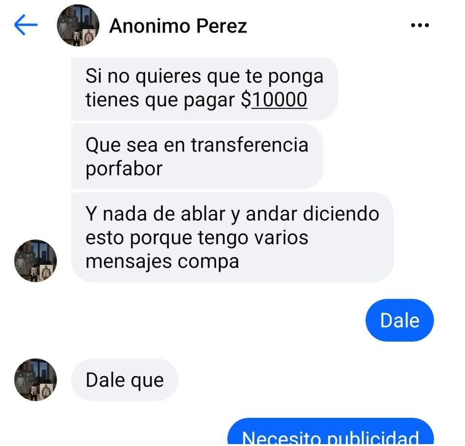 “Recibo llamadas de números anónimos, donde si no les entrego una cantidad de 10 mil pesos van a subir videos y audios míos donde estoy comprando gente”, reveló.