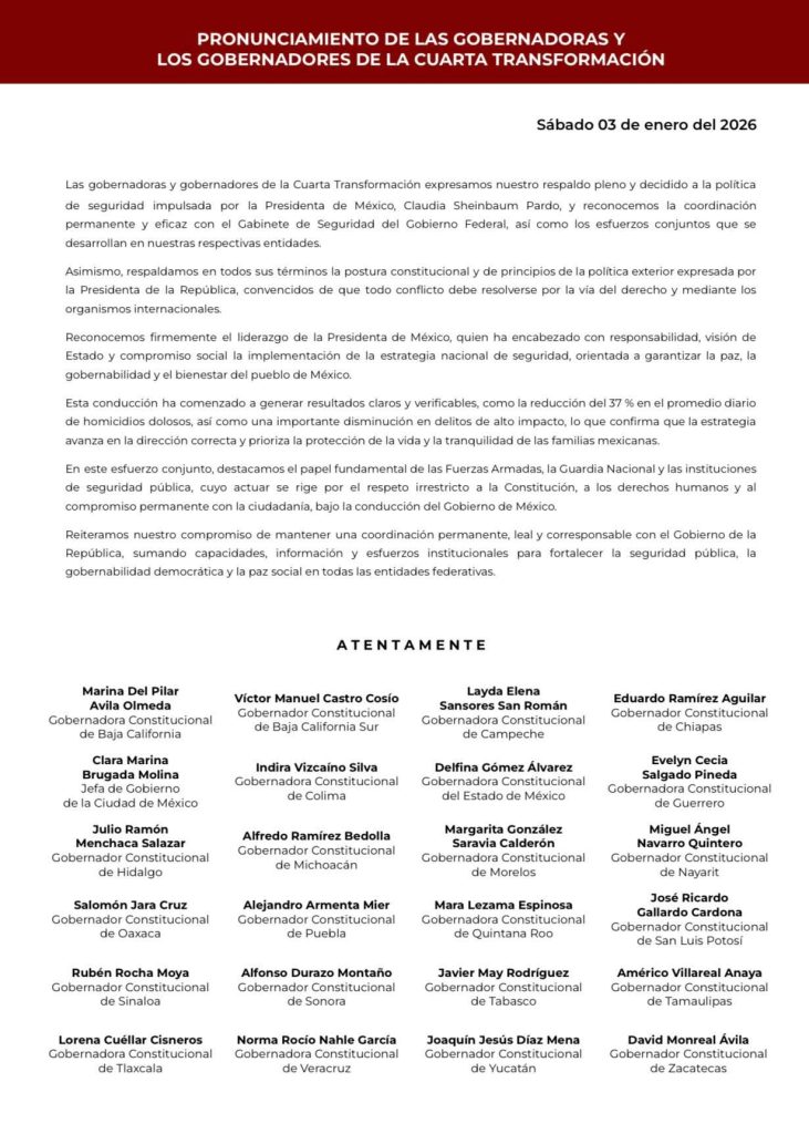 El respaldo de las y los mandatarios estatales se enmarca en un llamado a la unidad nacional y al fortalecimiento de la gobernabilidad, al tiempo que reconocieron el liderazgo de la presidenta Claudia Sheinbaum y su compromiso de impulsar una relación internacional equilibrada, respetuosa y orientada a la estabilidad del país.