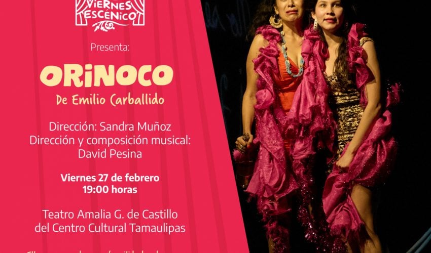 Ciudad Victoria.- Este viernes 27 de febrero a las 19:00 horas, la obra de teatro «Orinoco», original del célebre dramaturgo mexicano Emilio Carballido se presentará en el teatro Amalia G. de Castillo del Centro Cultural Tamaulipas, dando inicio al programa «Viernes Escénico».