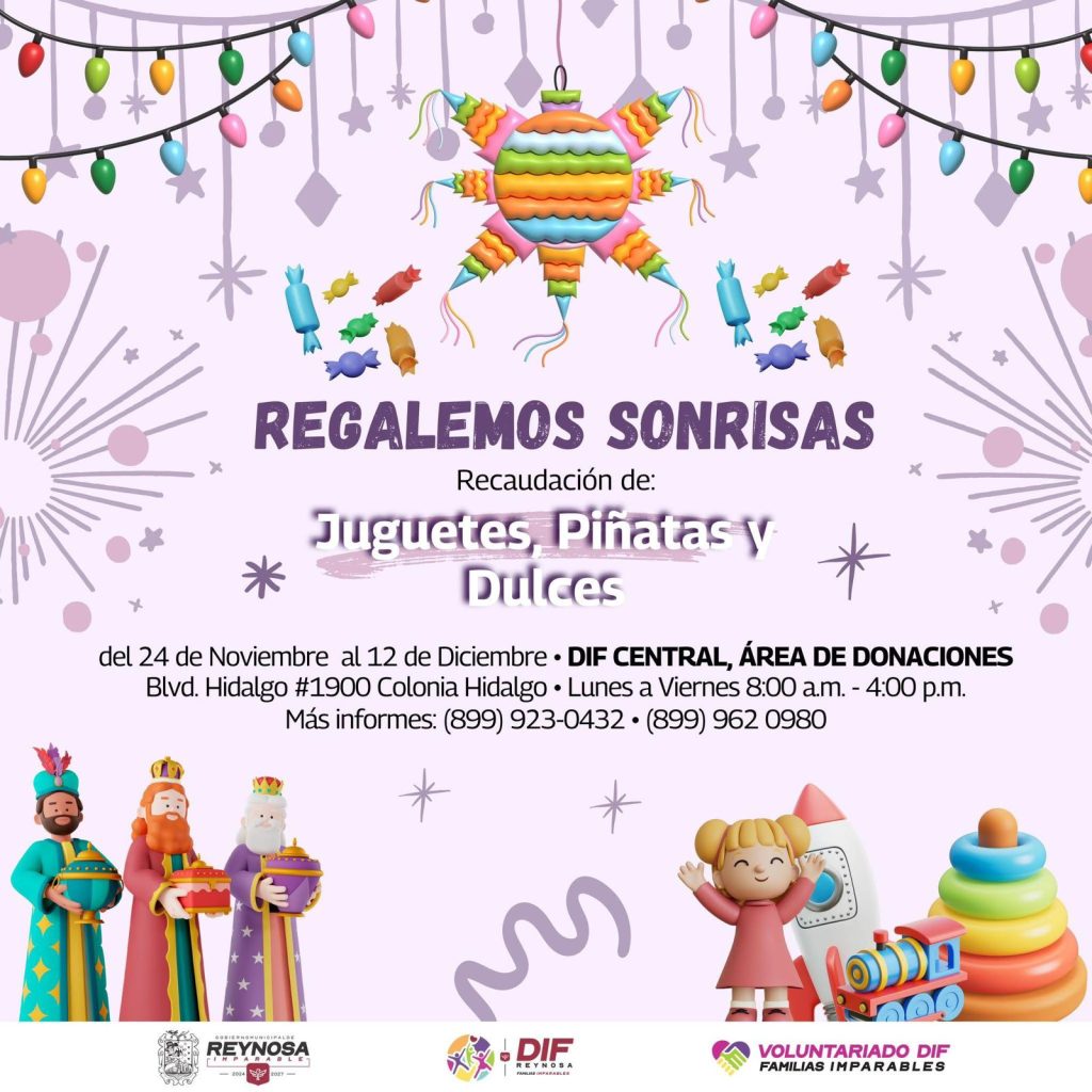 El Alcalde Carlos Peña Ortiz te invita a colaborar en la recaudación de Juguetes, Piñatas y Dulces, los cuales se harán llegar a los niños en condición vulnerable mediante la campaña del Voluntariado DIF que preside Alejandra Yelitza Garza, “Regalemos Sonrisas”, que recibirá sus donativos hasta el día 12 de diciembre en el DIF Central, ubicado en bulevar Hidalgo # 1900 de la colonia Hidalgo.